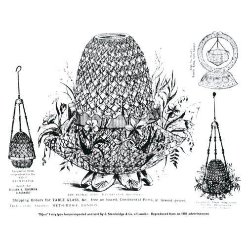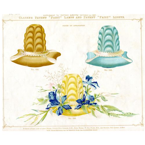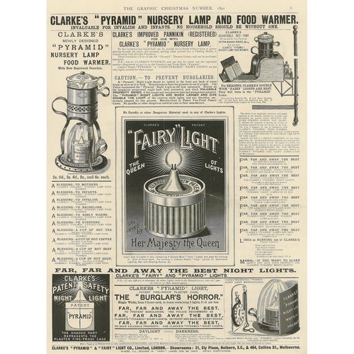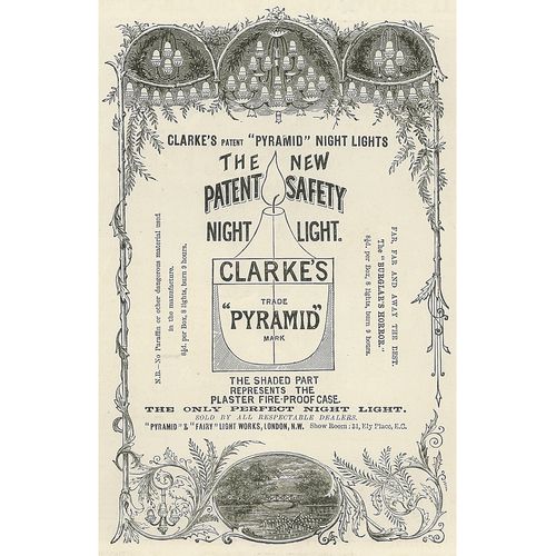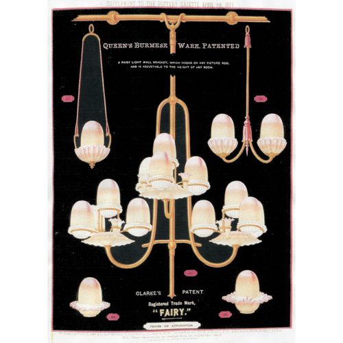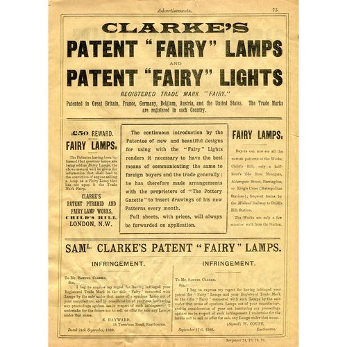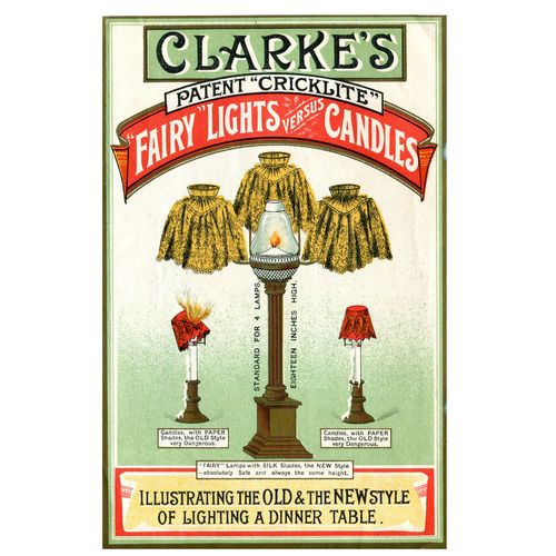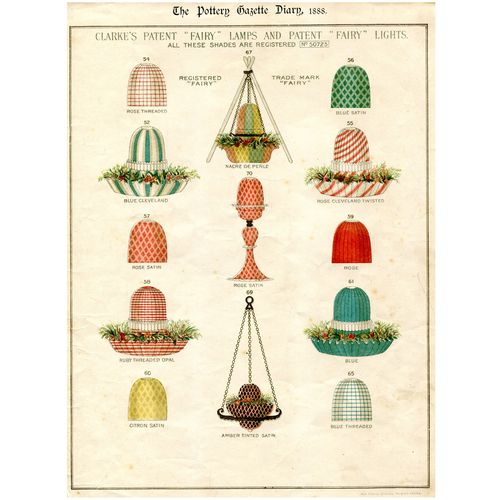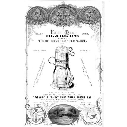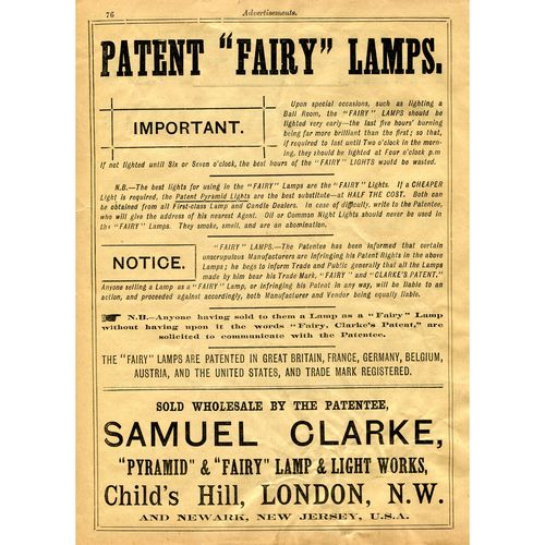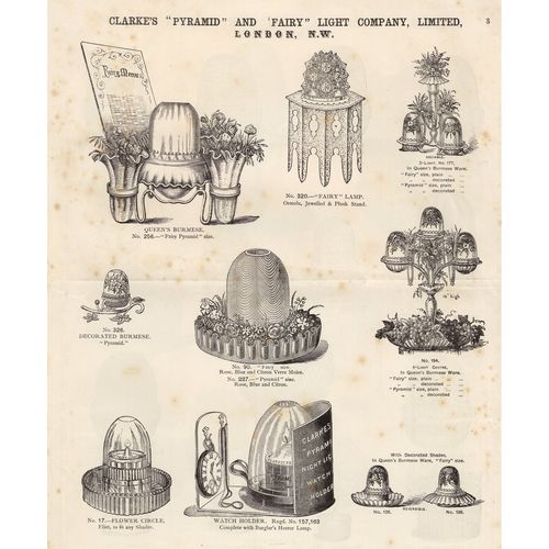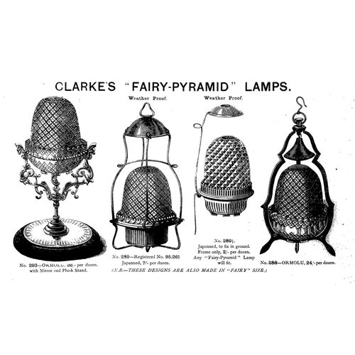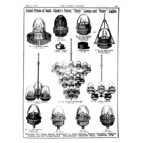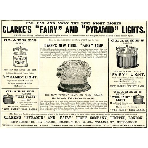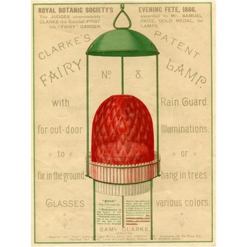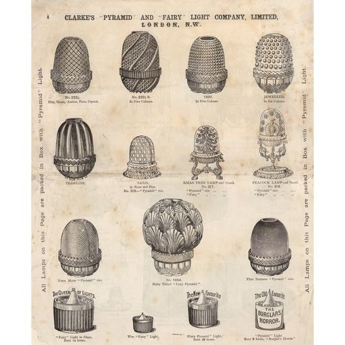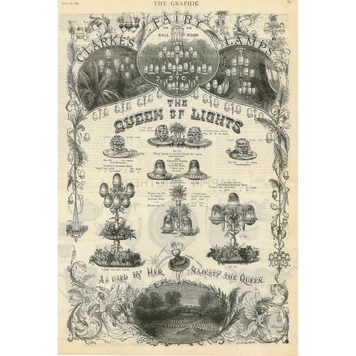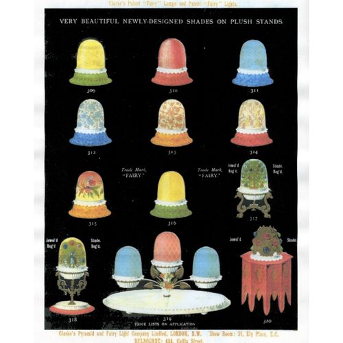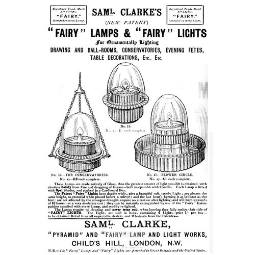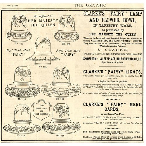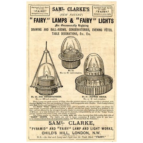 Catalogs, design books, and advertisements during the Victorian-era are an invaluable source of information. Samuel Clarke was a prolific advertiser for his fairy lamp and fairy lights. His ads appeared in nearly all the major publications of the time and many were in full color. The advertisements were often full page and the illustrations were very precise and detailed leaving nothing to the imagination