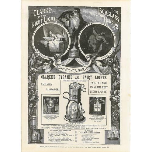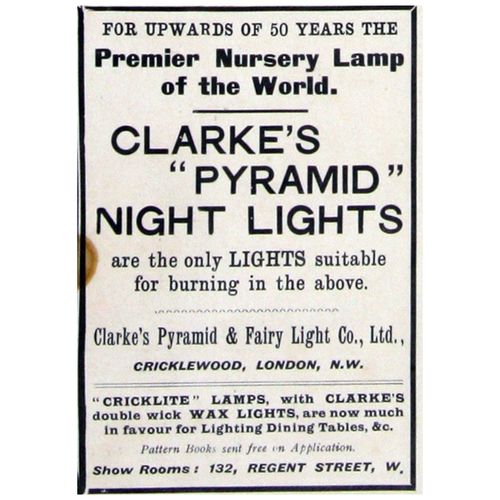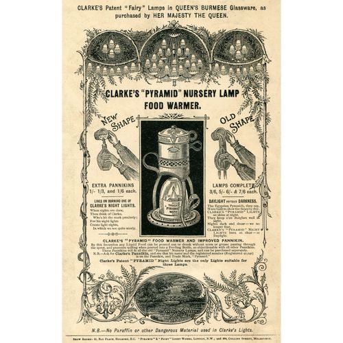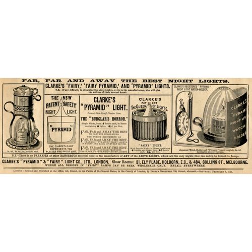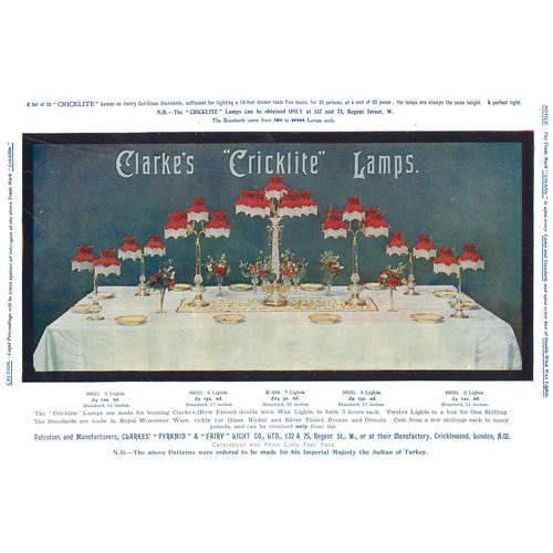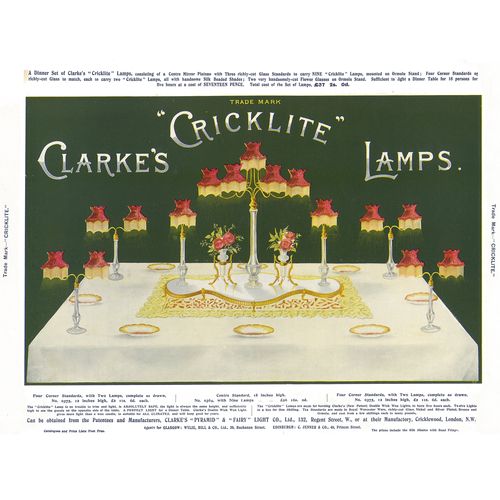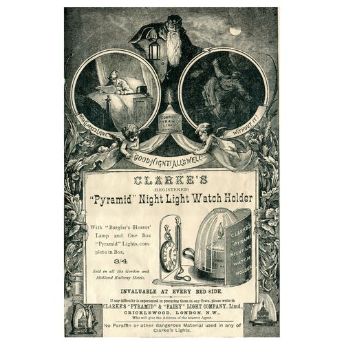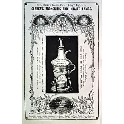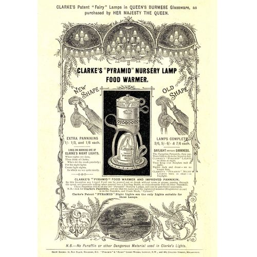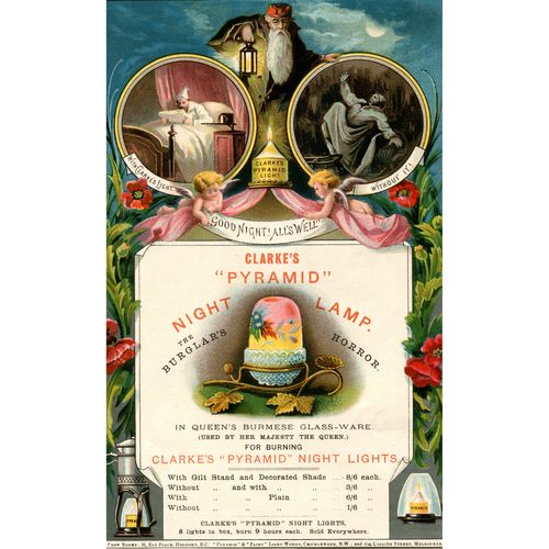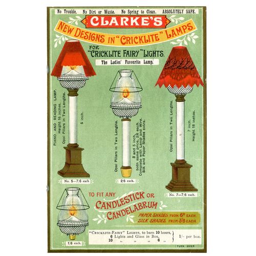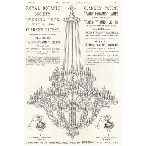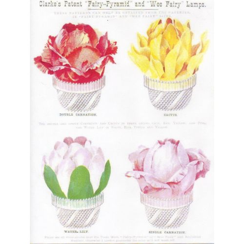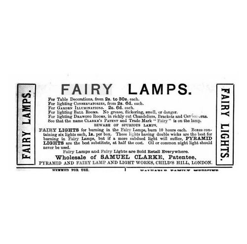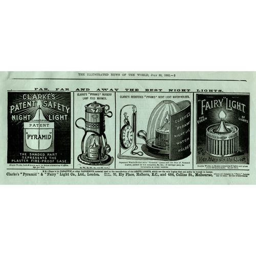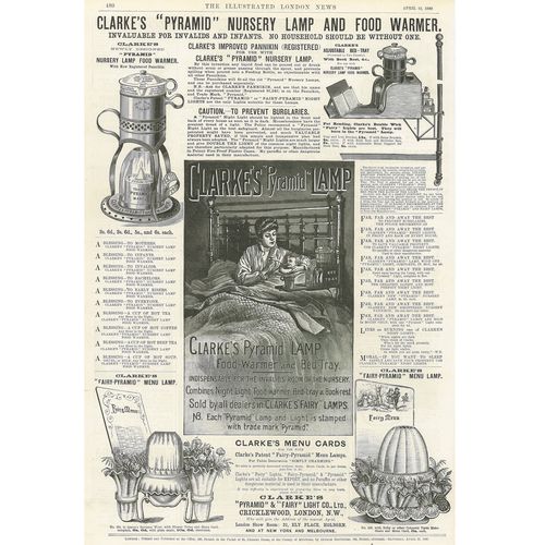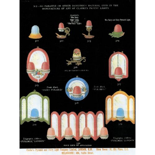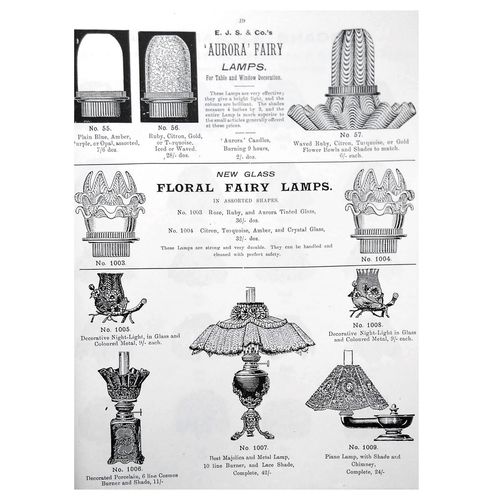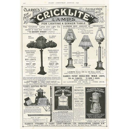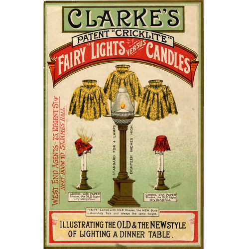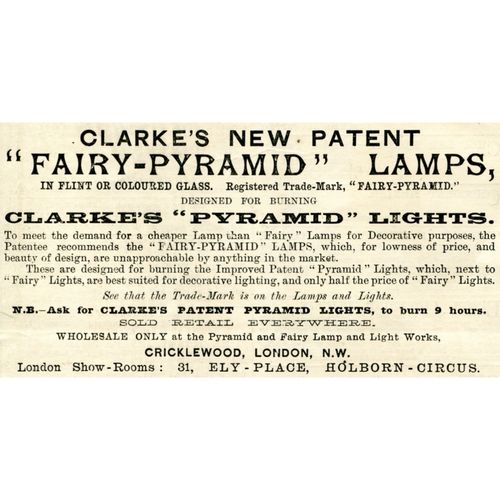 Catalogs, design books, and advertisements during the Victorian-era are an invaluable source of information. Samuel Clarke was a prolific advertiser for his fairy lamp and fairy lights. His ads appeared in nearly all the major publications of the time and many were in full color. The advertisements were often full page and the illustrations were very precise and detailed leaving nothing to the imagination