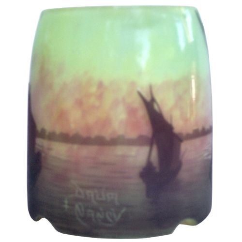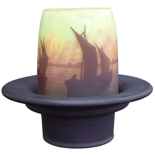 Shade is decorated with cameo sailboat scene. Shade is signed "Daum Nancy" with Cross of Loraine trademark. Base is unmarked and appears to be undecorated "blank" matching the shade.