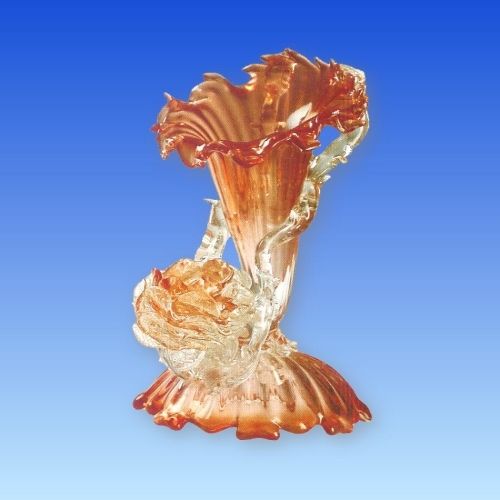 Floral-shaped cranberry dome with three rows of applied clear petals resting on seven applied amber leaves that form the lamp cup. Amber stem has hand formed 360o twist. Three applied leaves form the base. 7.75"h. Similar dome shown in R-490 & R-133