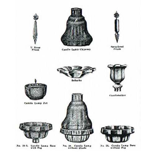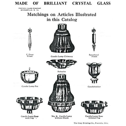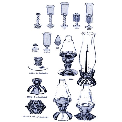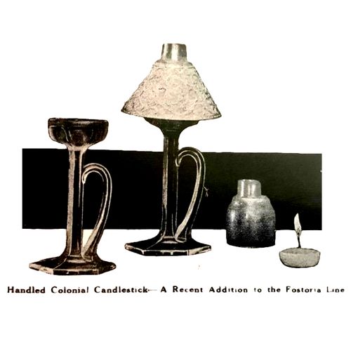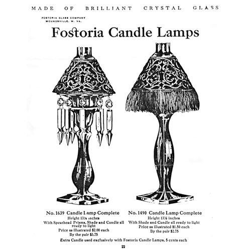 After the turn of the century, approximately 1909, Fostoria produced several lines of short candlesticks to which they added a chimney and a lamp base and called them Candle Lamps. These are closely associated with and are often confused Clarke's Cricklites.