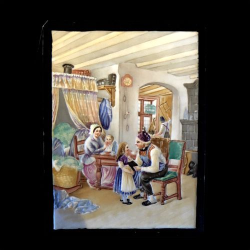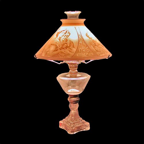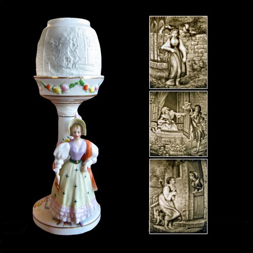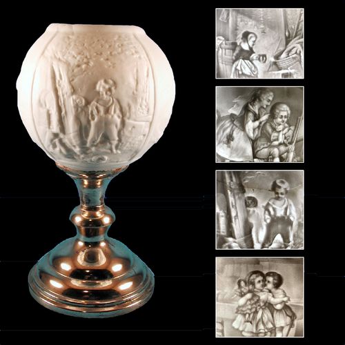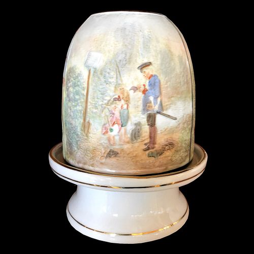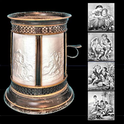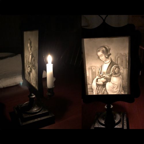 Tole decorated tin frame with tin drawer and single candle holder. Lithophane has has faint stamp (B) on the front and back. Scene is Interpretation of a painting Die Kirchgangerin (The Churchgoer or Worshipper) by Louis Ammy Blanc 1835.