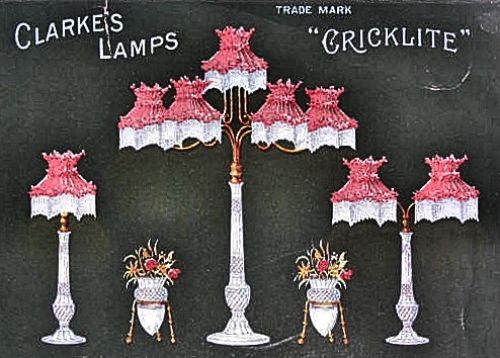 The following examples include illustrations for Clarke's catalogs, 1887-1888, and actual examples submitted by Fairy Lamp Club members and photos obtained from other on-line sources.