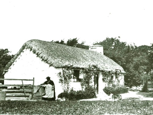 An illustration from c.1847 showing the white cottage, the far section higher than the rest, with thatched roof through which dormer windows are punctured.