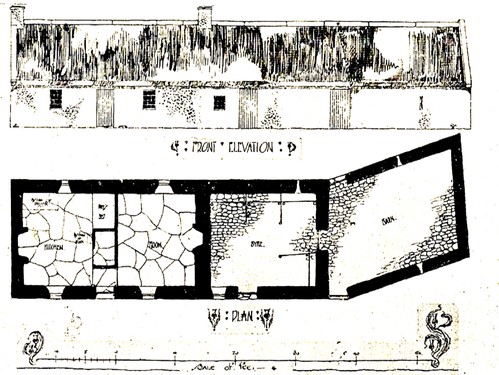 A typical Manx cottage is roughly 30 feet x 15 feet x 12 feet on the outside. The kitchen (sliamyr aarlee) is about 18 feet x 14 feet, the loft (lout),12 feet x 12 feet; the walls whitewashed, and thatched with straw-ropes (sugganyn), made fast to pieces of stones (bwhid suggane), which jut out from the walls.