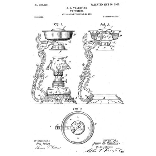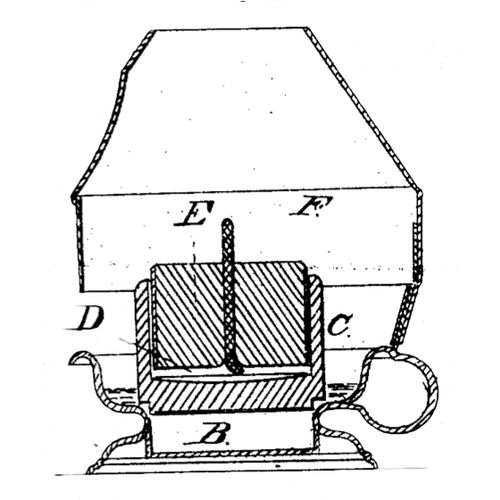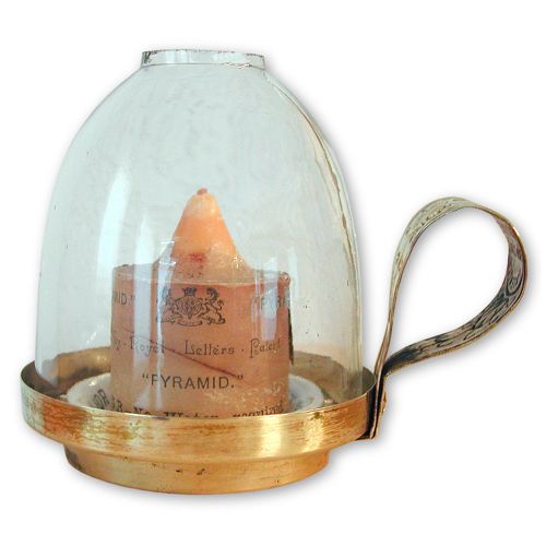 The sides serve as a gallery for a glass chimney which is cylindrical and made with a comparatively small hole at the domed top. In the sides and within the glass are numerous small air holes.