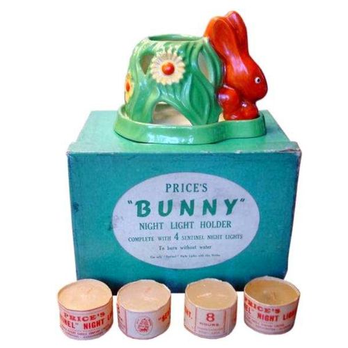 The "Bunny" was marketed by the Price Candle Company but, like Clarke, they did not actually make it. It was made by Wadeheath Pottery and is marked on the base "Wadeheath Ware England"