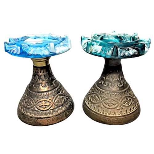 The heavy metal base is connected to a pressed slag candle holder by a brass fitting. The shade shown may not be original. However, the base could have been marketed without a shade. The base embossed around the bottom edge reads "Price's Patent Candle Co.". In addition, the base is embossed with an indecipherable lozenge. The Trefoil design on the base suggests it may have a religious association. (Click thumbnails to enlarge)